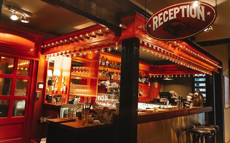 La zona del bar y recepción está decorada con asientos de cuero y detalles de decoración vintage. Además, tiene una iluminación tenue y tonos de rojizos que crean un ambiente como si estuvieras en una película.
