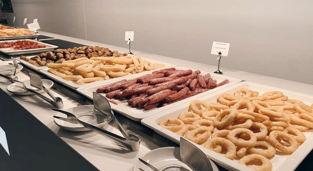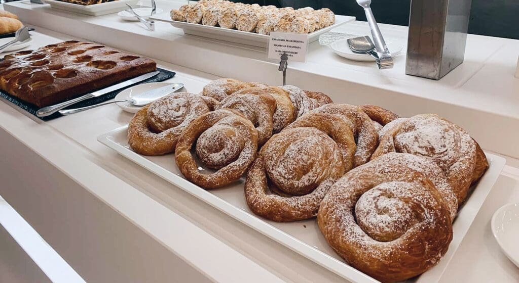 Creo que es el más completo que hemos visto hasta ahora. Tenía de todo: ensaimadas, mermeladas caseras, un chico haciendo tortitas y huevos, churros…