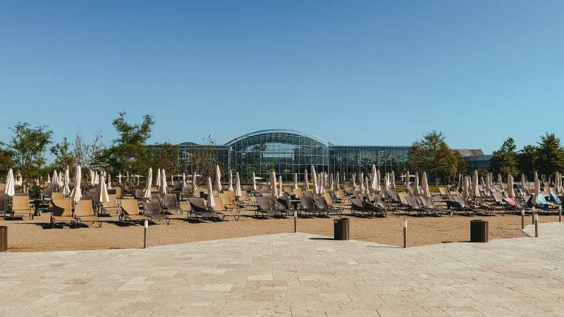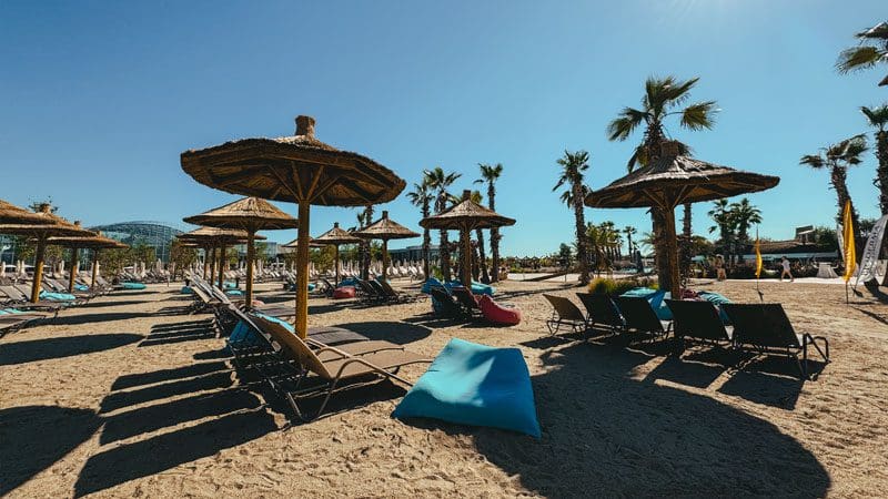 Sands of Therme Beach es la playa urbana más grande de Europa, con 30,000 metros cuadrados de arena fina, una piscina tropical, un bar de piscina, y una estación de hamburguesas y helados.