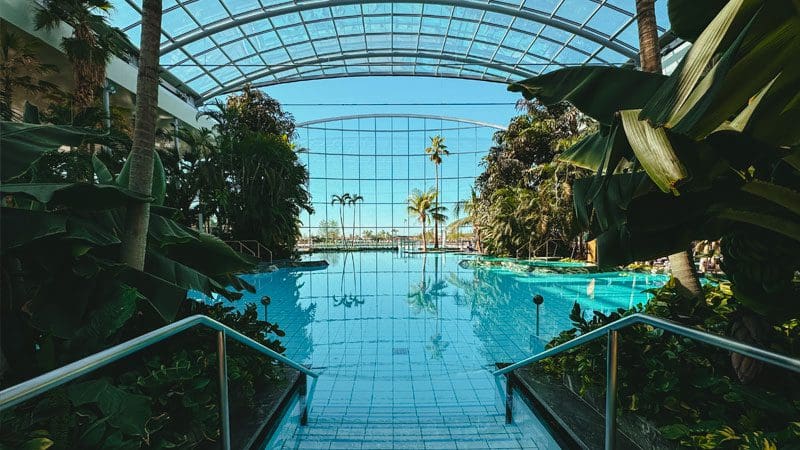 Therme Bucarest combina spa, parque acuático y centro de bienestar en un solo lugar. Su diseño arquitectónico incluye elementos naturales y una atmósfera tropical que invitan a la relajación desde el primer momento.