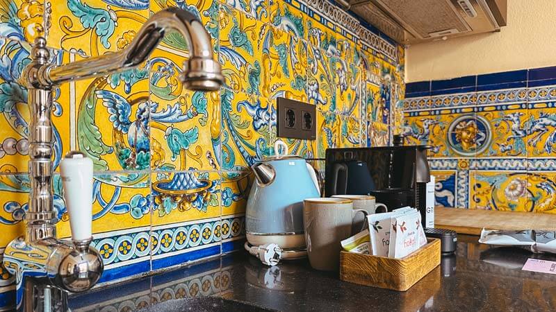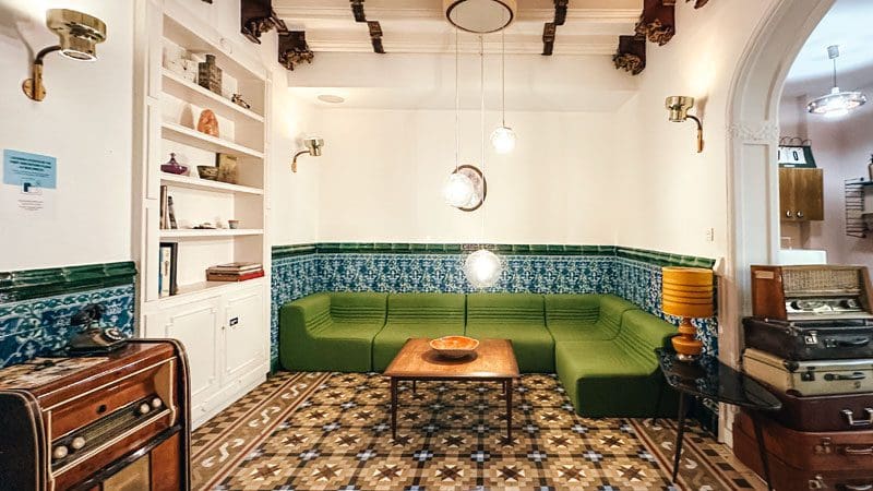 Además, nos sorprendió encontrar un pequeño salón con un acogedor sofá y chimenea de nuevo decorado con objetos vintage y azulejos.