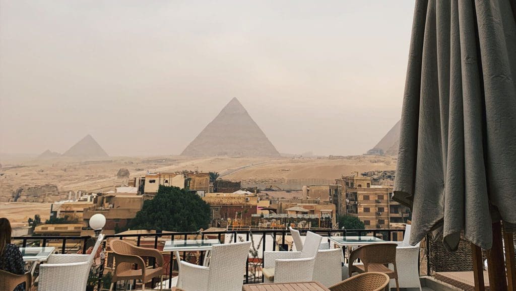 Elegimos el Hotel Mamlouk Pyramids por sus vistas a las pirámides pero cometimos un error eligiendo la “Habitación Doble Estándar con vistas panorámicas a las pirámides”, porque no tenía balcón pero las vistas eran completamente frontales.