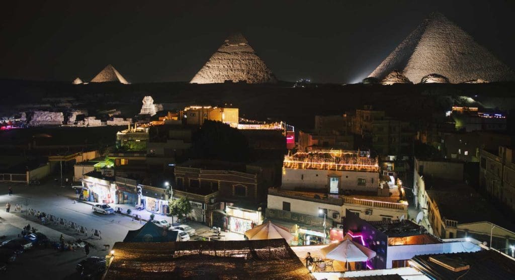 Las pirámides principales son las de Giza destacando las tres más famosas de Keops, Kefrén y Micerinos y os recomendamos muchísimo buscar un hotel con azotea que tenga vistas para pasar al menos una noche (y disfrutar el espectáculo de luces gratis 😜).
