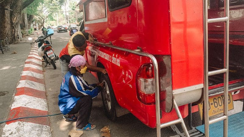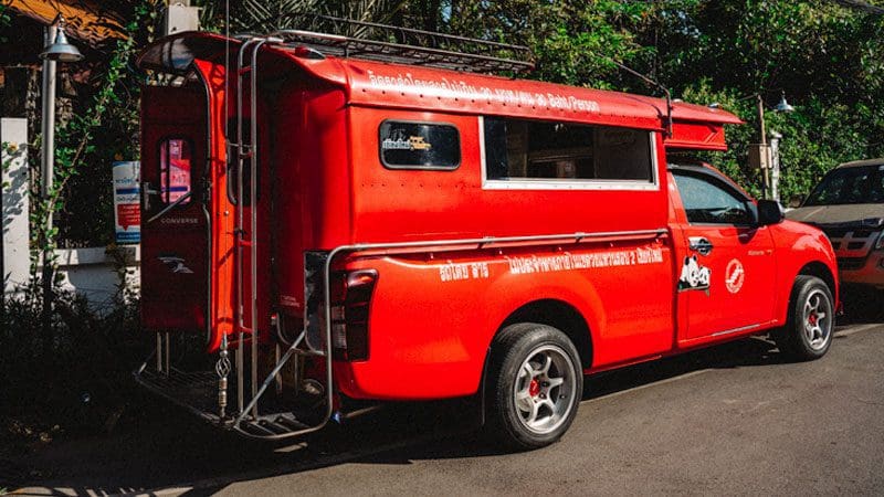 Estas furgonetas rojas son una opción popular para viajar en Chiang Mai. Con capacidad para varias personas, los songthaews son una forma económica y conveniente de moverse por la ciudad especialmente si vais varios.