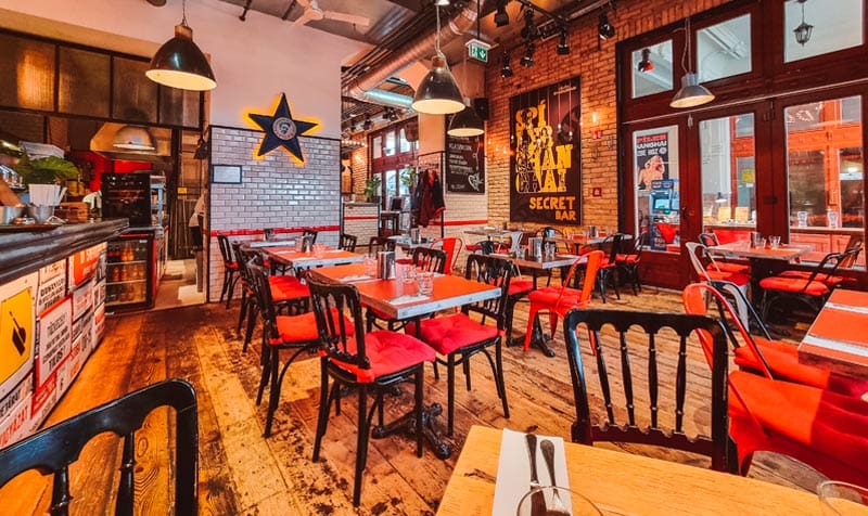 El restaurante se destaca por su decoración única, que mezcla elementos de arte urbano y estilo retro, creando un ambiente moderno.