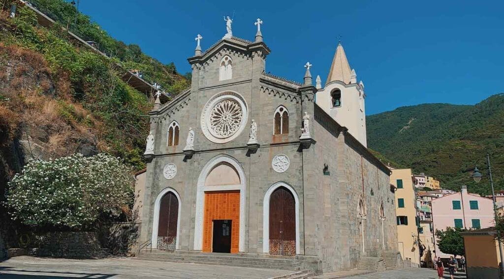 El edificio que preside todas fotos de Vernazza es el campanario de 40 metros de la Iglesia de Santa Margherita d’Antiochia, construida en 1318 frente al mar en estilo gótico.